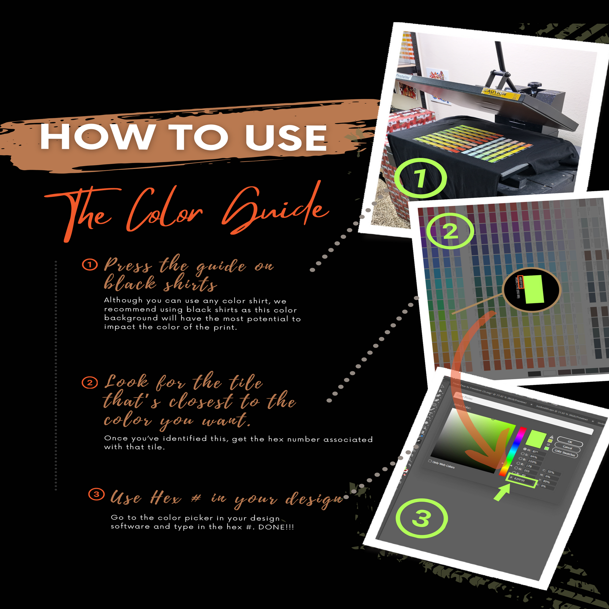 No more guessing on what color will print. Order our color swatch and press on a black shirt and know exactly what the colors will be when you enter the HEX#. It's simple